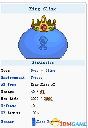 史莱姆王是一个boss,正如它名字说说的那样,它非常大。它大约是彩虹史莱姆的5倍(最大的普通史莱姆)
