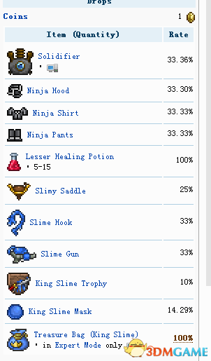 掉落物:凝固机(用于制作史莱姆块和史莱姆系列家具,在1.3之前这要在朋克妹子那买的,现在不知道卖不卖了。。。 )