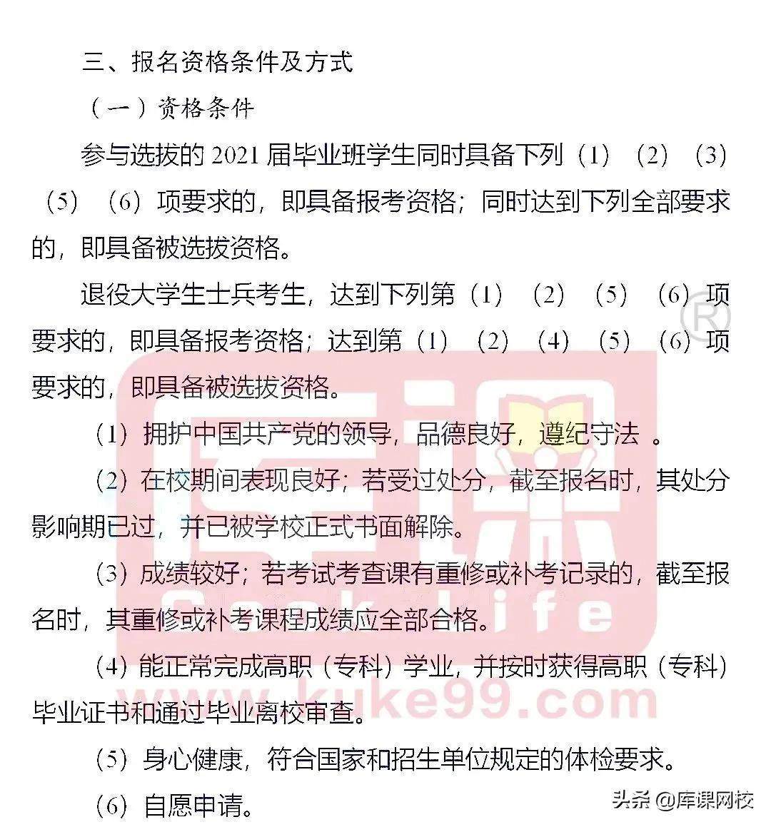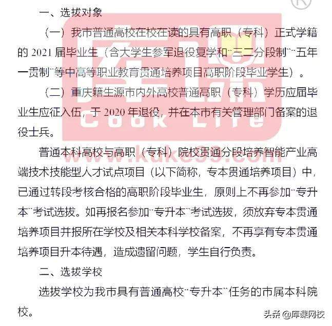 2021年吉林省普通高职高专院校应届毕业生。选拔方式:省教育厅统一组织选拔考试,按考试成绩和录取比例择优选拔。
