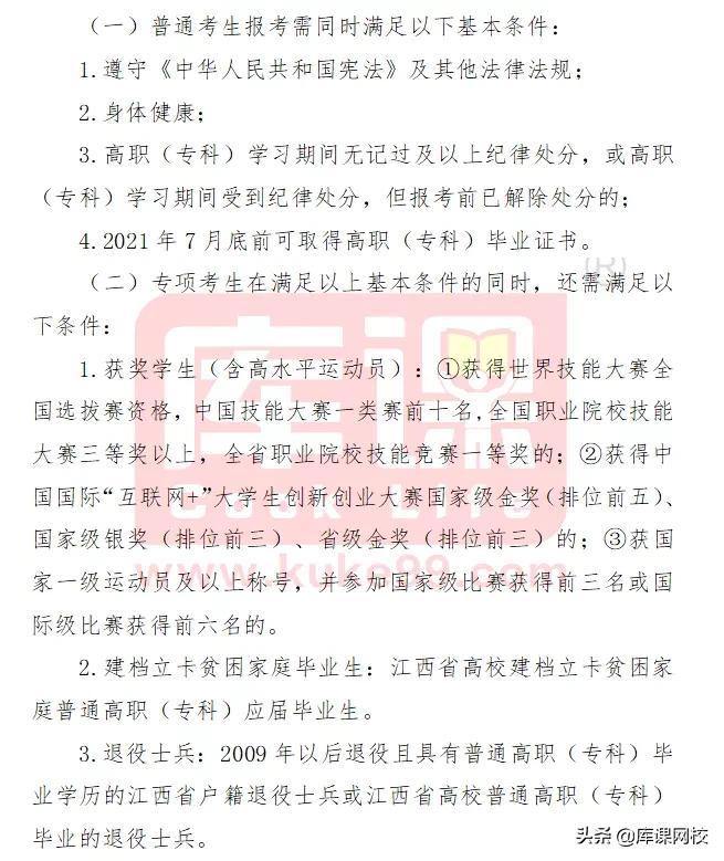 (1)我省普通全日制高职(专科)2021年应届毕业生,且截止2021年8月31日取得当年应届普通专科毕业资格(获得毕业证书),或具有我省高职(专科)学历的退役士兵;
