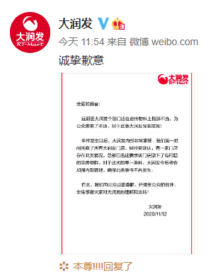 大润发还称,近期因大润发个别门店在宣传物料上措辞不当,为公众带来了不适,对于此事大润发深表歉意。事件发生以后,大润发第一时间彻查了所有大润发门店。经排查确认,有一家门店存在此类情况,总部已迅速要求该门店撤下了有问题的宣传物料。对于此次的单一事件,大润发今后将会加强内部管理,确保此类事件不再发生。