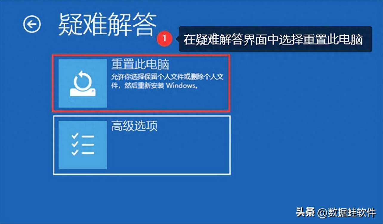 步骤1:按下电脑的开机按钮,等到出现开机图标后,长按电脑的【电源键】以强制关机。重复三次后,将出现自动修复界面。选择【高级选项】。在弹出窗口中,选择下面的【疑难解答】;