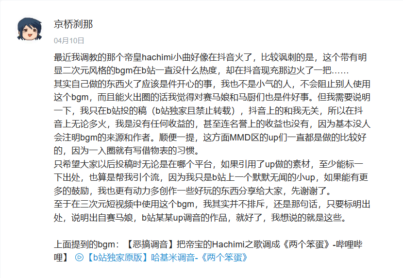 抛开语义的衍变不谈,无许可擅自搬运传播显然也是哈基米这个词充满争议的原因之一。在哈基米走红抖音的那段时间,哈基米调音的原作者在B站写下了他对此事的感想,他认为“火出圈对《赛马娘》和马厨们是件好事”,并且表示自己并不反对在可爱小动物的视频中加入哈基米的音乐,只希望转载者能标明音乐出处,帮粉丝本就不多的自己引个流。