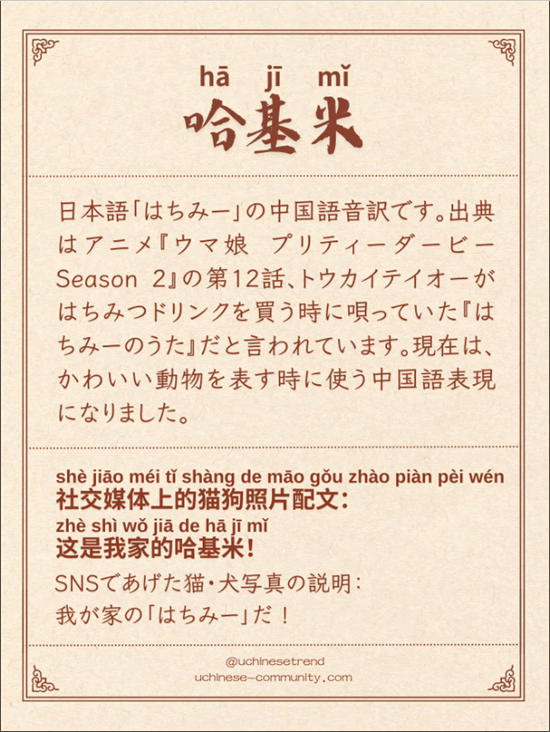 懂日语的朋友们或许会认为这是はちみ的中文音译,如果一定要较真的话,大概就是蜂蜜的意思;