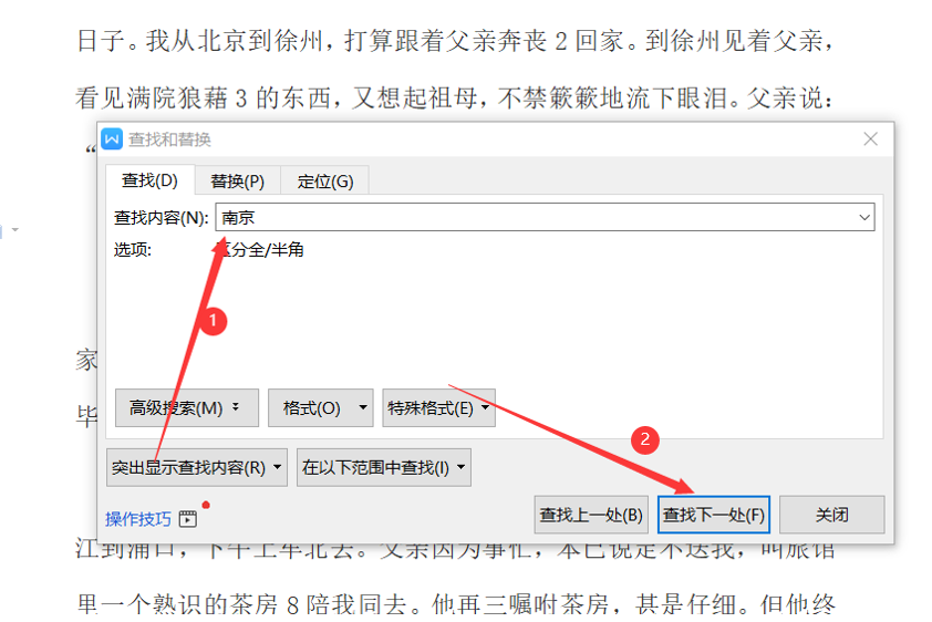 输入需要查找的字“南京”,点击查找下一处,如下图所示: