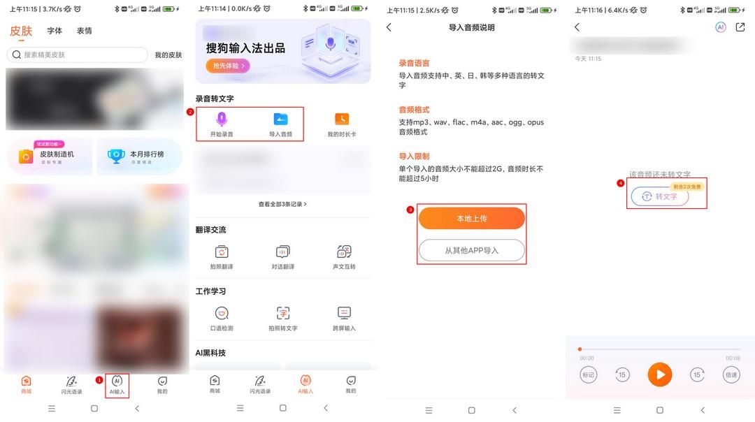 打开软件——“AI输入”——“导入音频”——根据自身音频存放的位置选择上传方式,我们可以选择“本地上传”也可以选择“从其他APP导入”——点击“转文字”按钮即可。