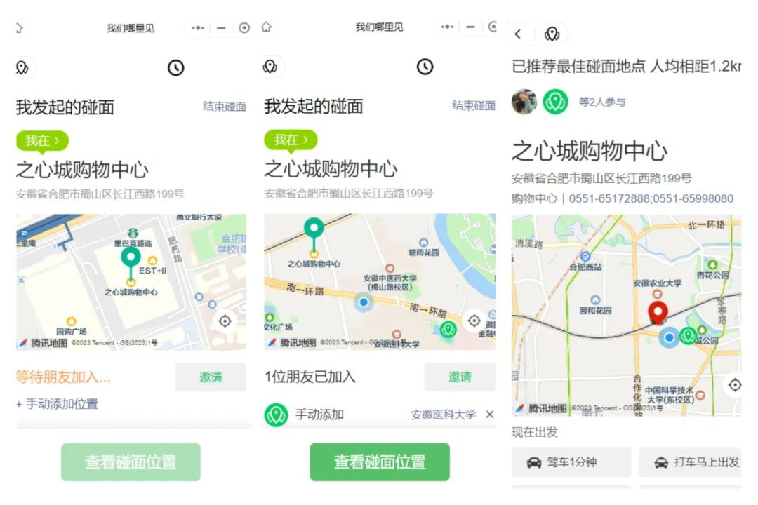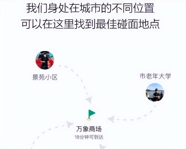 在一座城,三五好友在哪碰面?这是个问题。离你太远,不行;离我太远,也不行。点开“我们哪里见”小程序,输入各自地址,再点击“查看碰面位置”,就能自动生成最佳碰面地点。